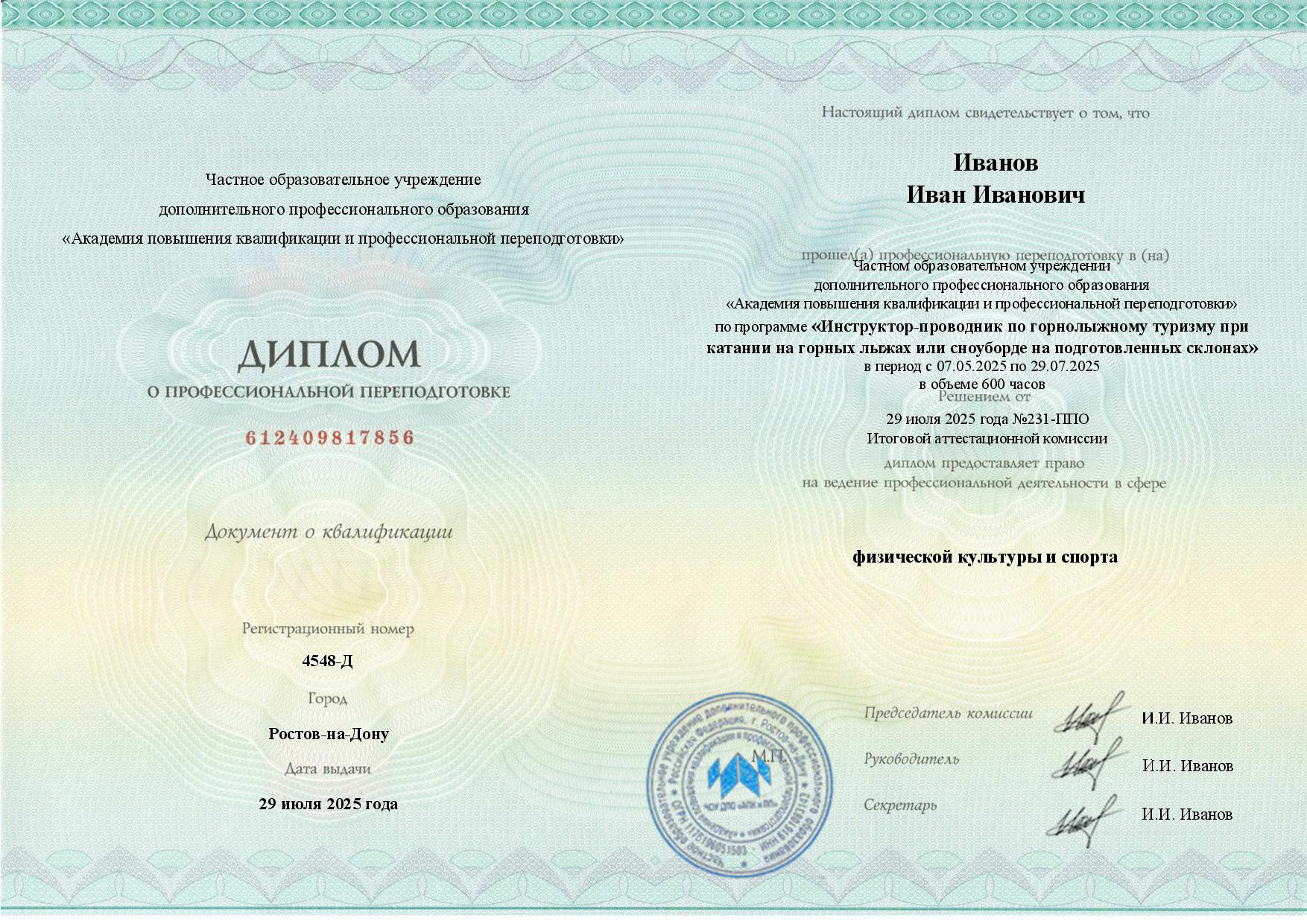 По итогу заочного обучения на инструктора-проводника по горнолыжному туризму при катании на горных лыжах или сноуборде на подготовленных склонах Вы получите диплом о профессиональной переподготовке с правом ведения деятельности. В дипломе указывается название программы «Инструктор-проводник по горнолыжному туризму при катании на горных лыжах или сноуборде на подготовленных склонах», количество часов, дисциплины, входящие в учебный план. Дистанционная форма обучения в дипломе не указывается.