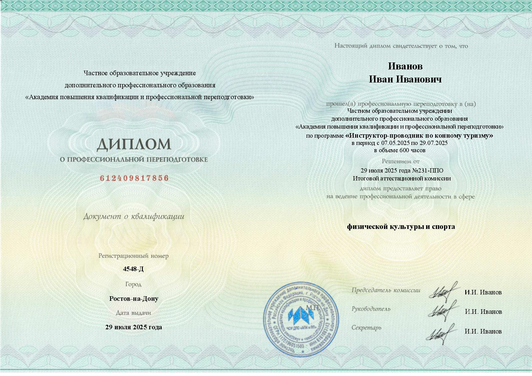 По итогу заочного обучения на инструктора-проводника по конному туризму Вы получите диплом о профессиональной переподготовке с правом ведения деятельности. В дипломе указывается название программы «Инструктор-проводник по конному туризму», количество часов, дисциплины, входящие в учебный план. Дистанционная форма обучения в дипломе не указывается.