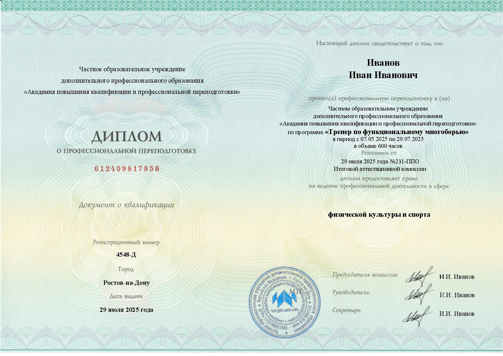 функциональному многоборью выдается диплом о профессиональной переподготовке,