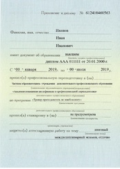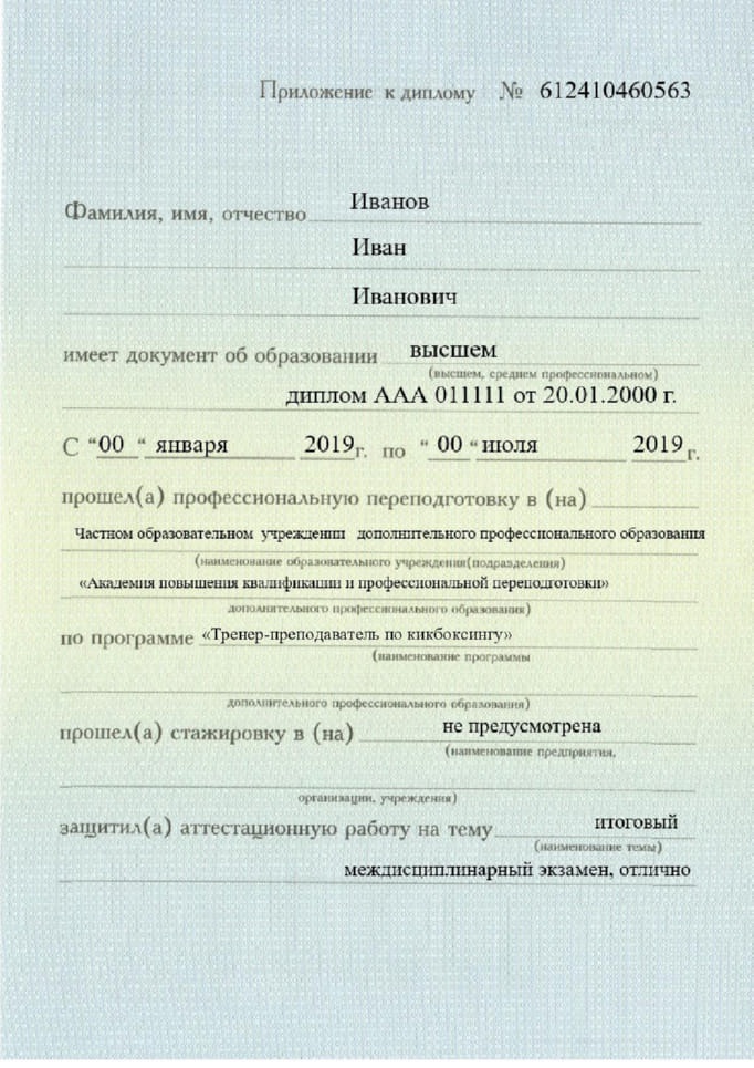 По итогу заочного обучения на тренера-преподавателя Вы получите диплом о профессиональной переподготовке с правом ведения деятельности. В дипломе указывается название программы «Тренер-преподаватель по кикбоксингу», количество часов, дисциплины, входящие в учебный план. Дистанционная форма обучения на тренера-преподавателя в дипломе не указывается.