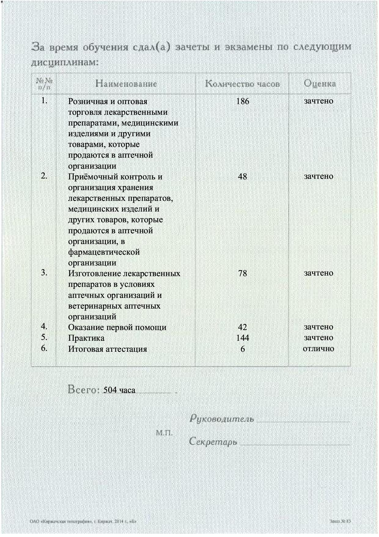 По окончании обучения вы получите легитимный Диплом о профессиональной переподготовке установленного государством образца. Наличие этого диплома дает право на осуществление фармацевтической деятельности (розничная и оптовая торговля, изготовление лекарств, первичная помощь) в аптечных организациях и медицинских учреждениях наряду с действующим дипломом о среднем профессиональном образовании.