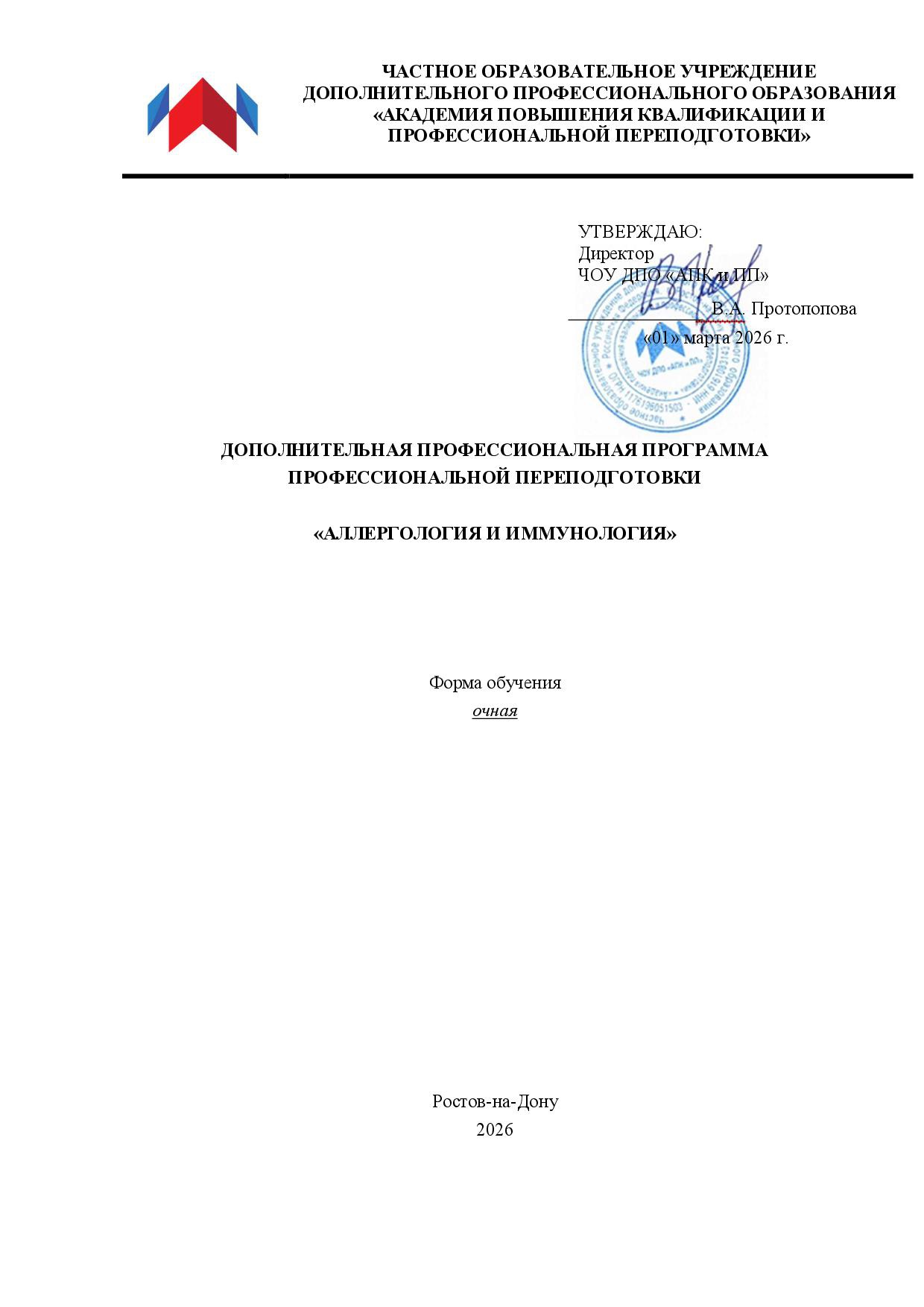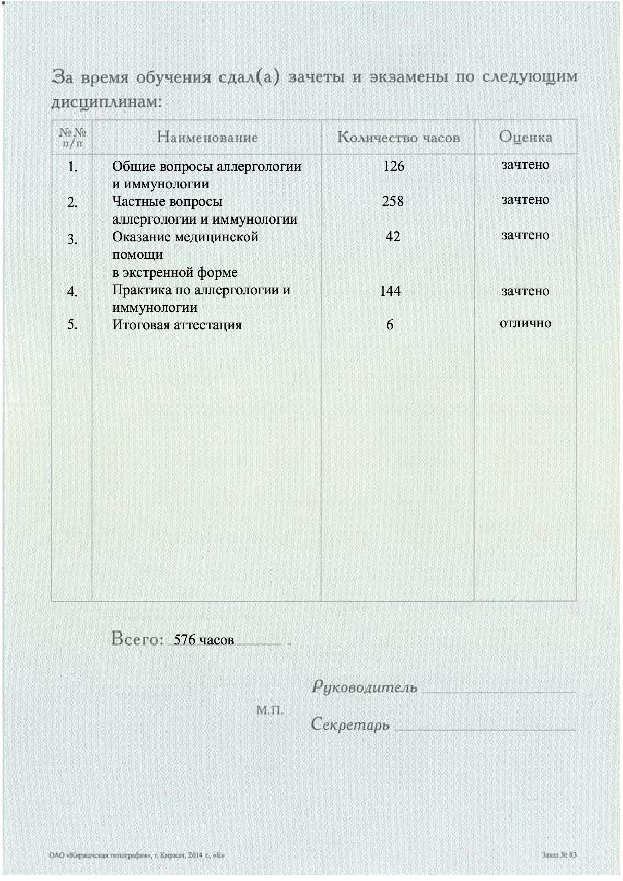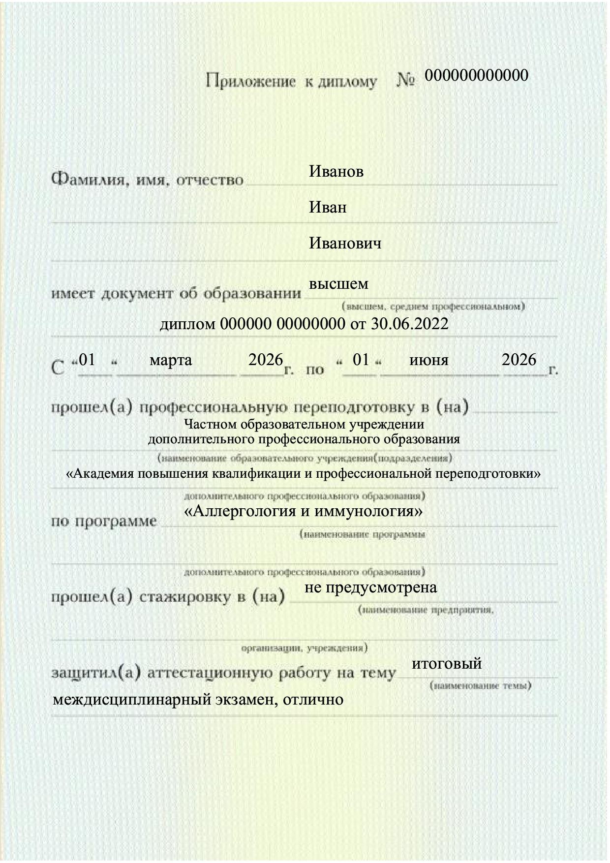 Успешное прохождение итоговой аттестации позволяет слушателям получить официальный диплом о профессиональной переподготовке установленного образца, дающий право на ведение профессиональной деятельности в области аллергологии и иммунологии.