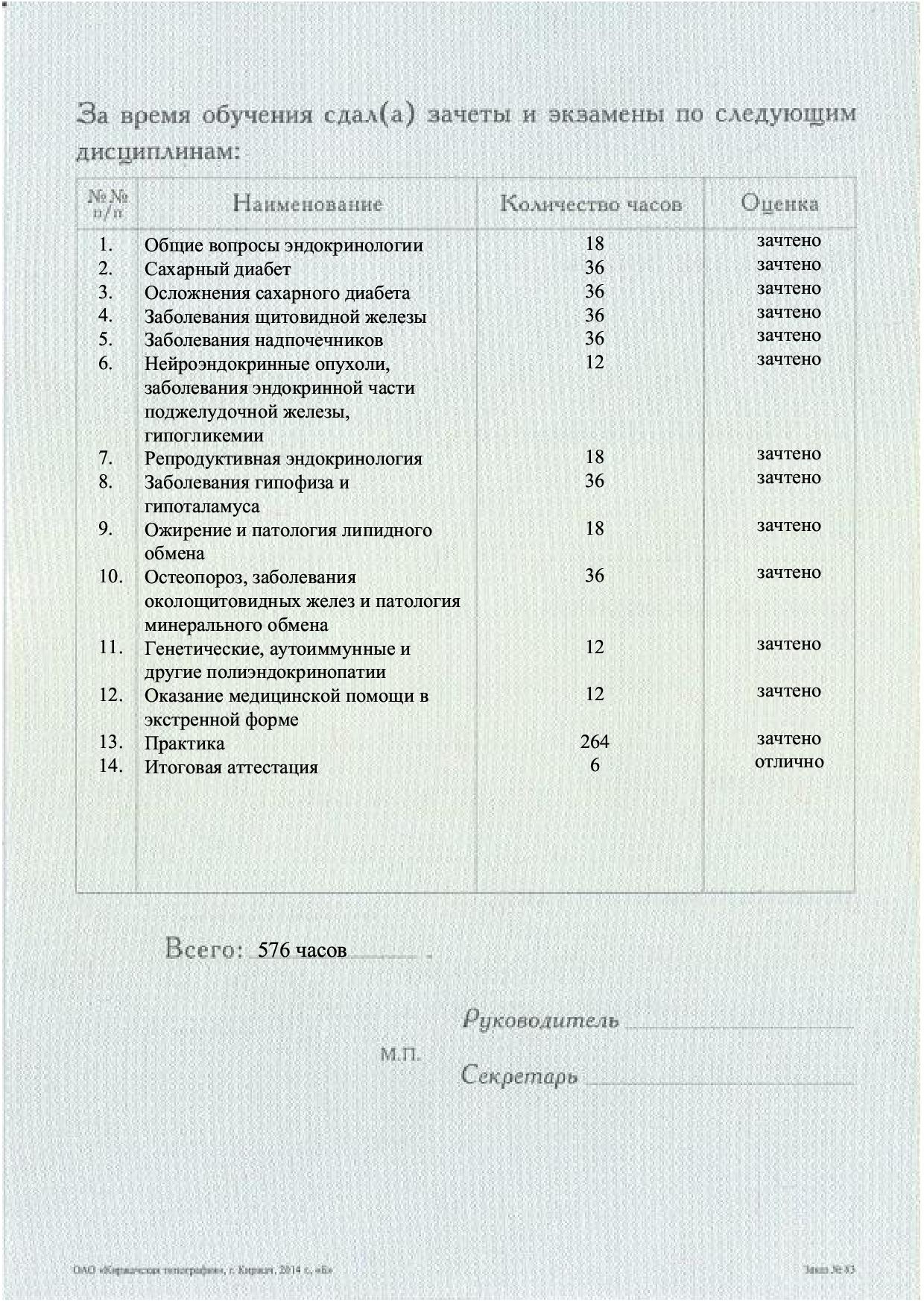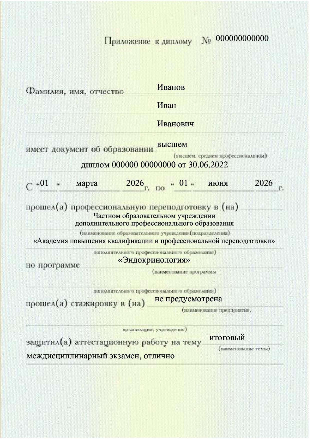 Успешное прохождение итоговой аттестации позволяет слушателям получить диплом о профессиональной переподготовке, дающий право на ведение деятельности в должности «врач-эндокринолог».