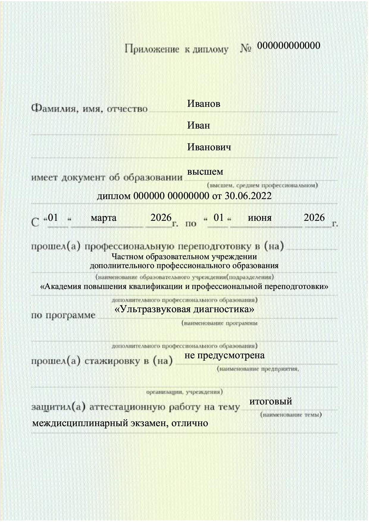 По окончании программы вы получите диплом установленного образца о профессиональной переподготовке с присвоением квалификации «Врач ультразвуковой диагностики», который даёт право на ведение профессиональной деятельности в этой области.